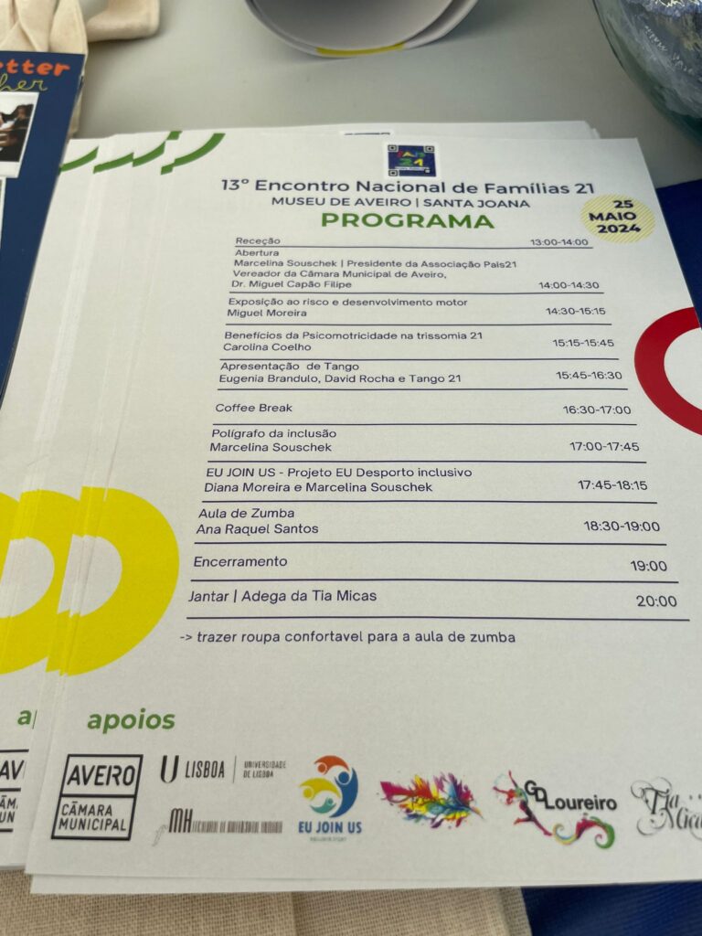 Este ano, com foco no desporto, as temáticas debatidas foram: “Exposição ao Risco e desenvolvimento motor” (Prof Doutor Miguel Moreira da FMH); “Benefícios da Psicomotricidade na Trissomia 21” (Mestre em Psicomotricidade Carolina Coelho), e “Eu Join Us – Modelo Europeu Desporto Inclusivo” (Mestre em Educação Especial Marcelina Souschek e Psicóloga Diana Moreira). Coube à presidente da Pais 21, Marcelina Souschek, o encerramento com sob o tema “Polígrafo da Inclusão”.