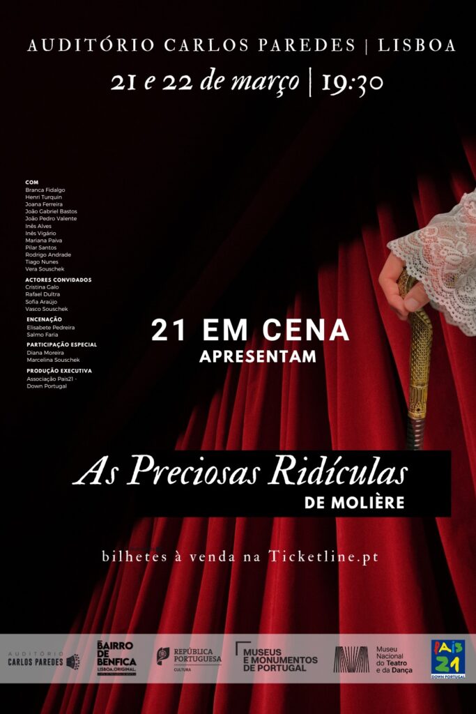 Estreia hoje, dia internacional da Trissomia 21, a peça de Molière, As Preciosas Ridículas, no Auditório Carlos Paredes em Benfica. Levada a palco pela companhia de teatro 21emCena com encenação de Elisabete Pedreira e Salmo Faria.