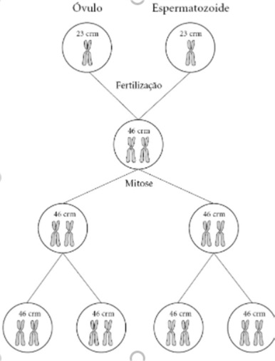 Quando um bebé é concebido, um espermatozoide e um óvulo combinam-se e formam um ovo fertilizado (primeira célula de qualquer organismo) com um conjunto completo de 46 cromossomas, 23 da mãe e 23 do pai. Essa célula divide-se, formando um novo organismo. Isso quer dizer que cada nova célula é uma cópia idêntica da primeira.